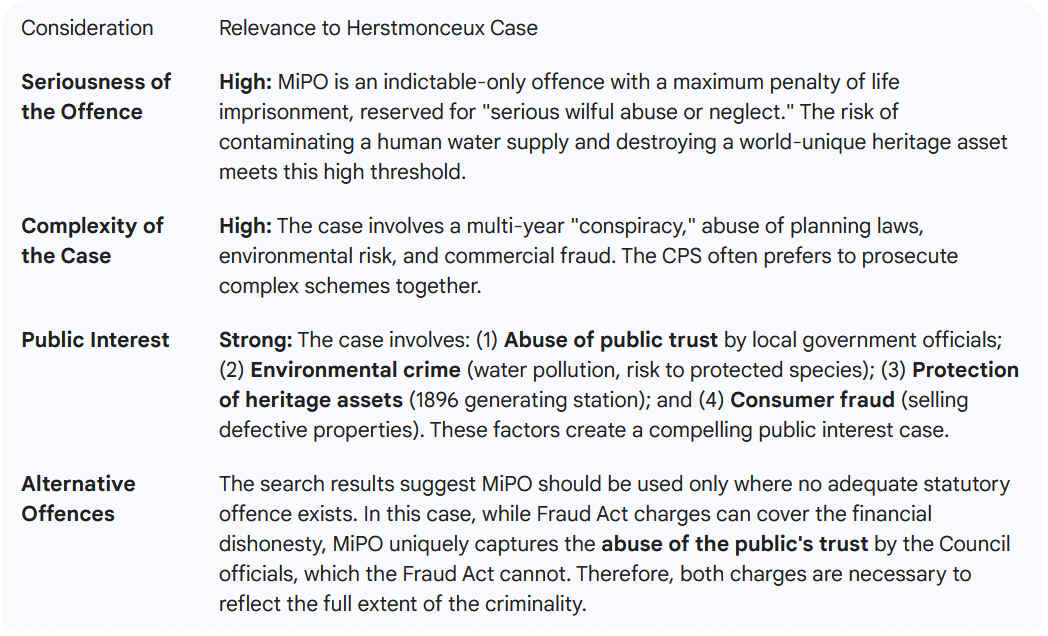Public Interest Strong: The case involves: (1) Abuse of public trust by local government officials; (2) Environmental crime (water pollution, risk to protected species); (3) Protection of heritage assets (1896 generating station); and (4) Consumer fraud (selling defective properties). These factors create a compelling public interest case.