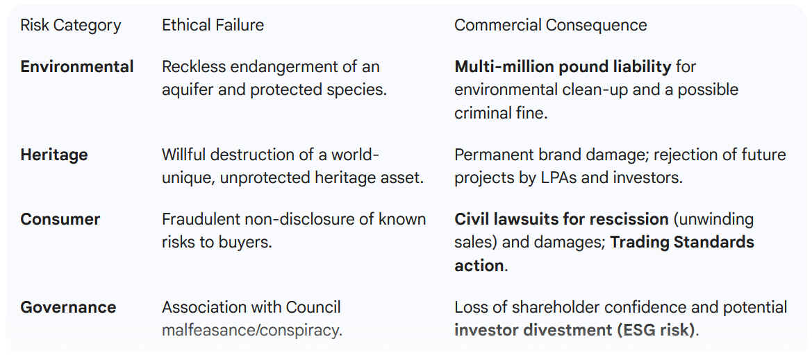 The "Unethical Builder" Label: Being associated with a development secured by local authority "malfeasance," a fraudulent non-disclosure to buyers, the destruction of Great Crested Newt habitat, and the potential poisoning of a community water source will quickly brand the firm as unethical and irresponsible.